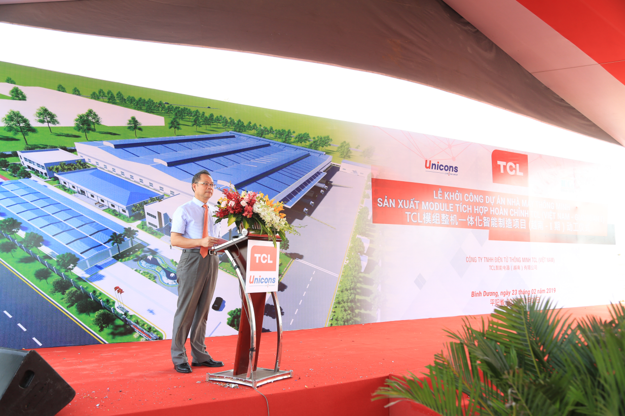 TCL电子CEO王成、中国驻胡志明市总领事馆韦锡臣参赞、平阳省人委会工业区投资审查委员会副主席阮成忠、TCL 项目组执行组长温志兴、越南建筑承包商Uincons总经理等共同出席了新制造基地的动土仪式。
